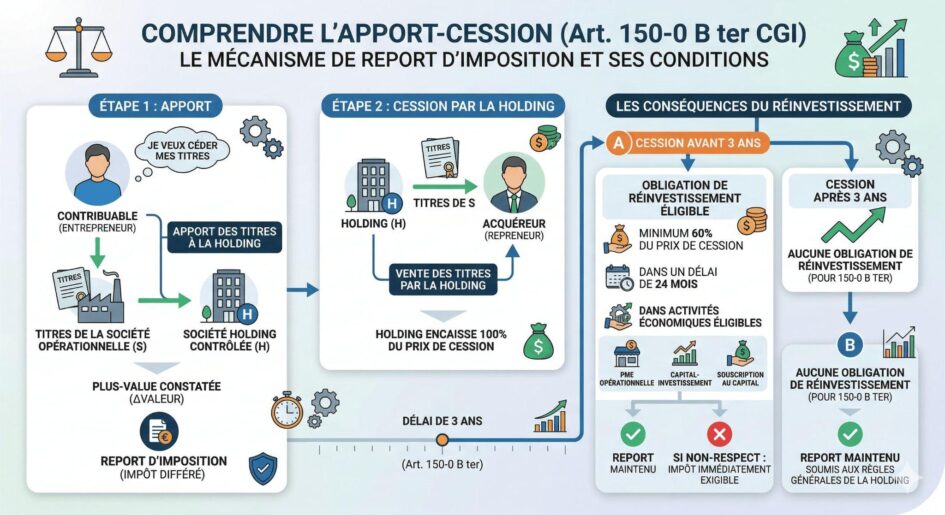 Le mécanisme est simple dans son principe : un dirigeant apporte les titres de sa société opérationnelle à une holding qu’il contrôle, puis la holding revend ces titres à un acquéreur. La plus-value générée lors de l’apport n’est pas taxée immédiatement, elle est placée en report d’imposition. Ce report est maintenu à condition que la holding réinvestisse une partie du produit de cession dans des activités économiques éligibles, si la cession intervient dans les trois ans suivant l’apport. Au-delà de trois ans, aucune obligation de remploi ne s’applique. Pour aller plus loin sur le fonctionnement complet du dispositif et ses cas d’application, consultez notre guide sur l’apport cession (150-0 B ter).